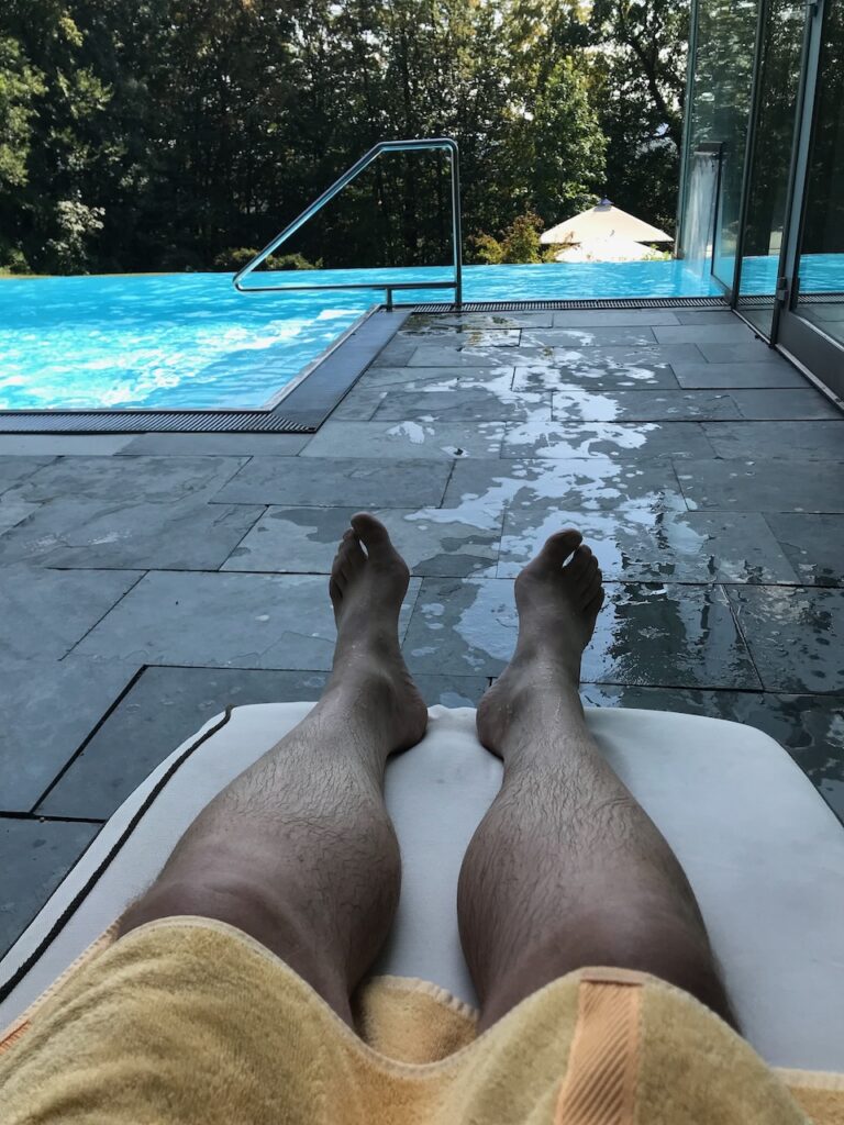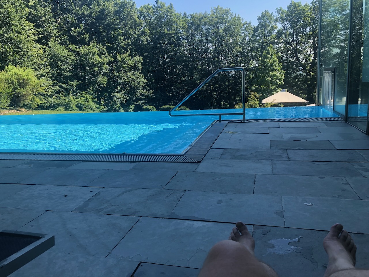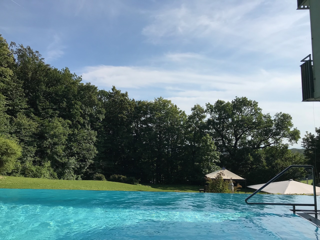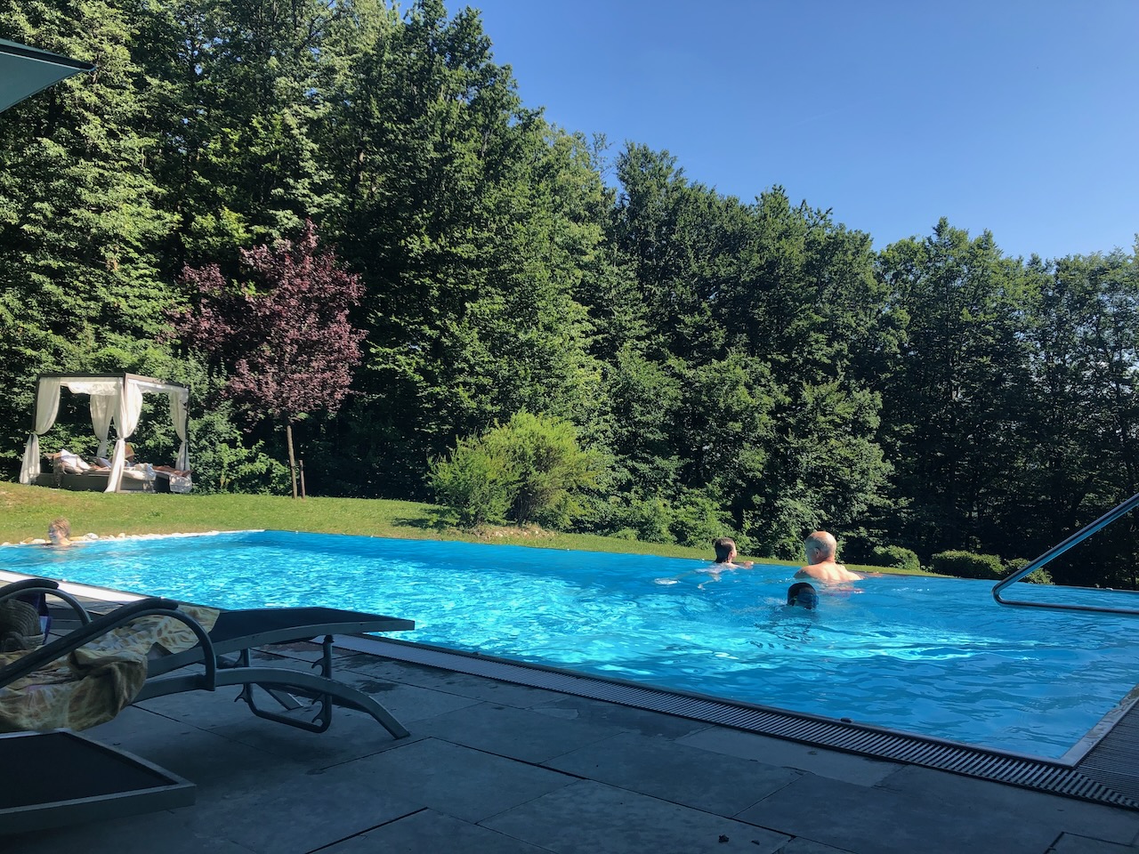 Ich wählte die Nummer und fragte ganz direkt und höflich, ob ich zum Schwimmen kommen kann, wenn ich auch zu Abend esse. Ich war damals alleine und hatte gerade begonnen, am Wochenende die ZEIT zu lesen – genug Stoff für einige Stunden am Pool. Zu meiner großen Verwunderung und Freude teilte mir die Receptionistin mit, dass die Chefin da manchmal eine Ausnahme macht und dass sie fragen wird. Und so war ich eine Stunde später nach 48 Jahren wieder an dem Platz, an den ich mich dunkel aus Kindheitstagen erinnern konnte.