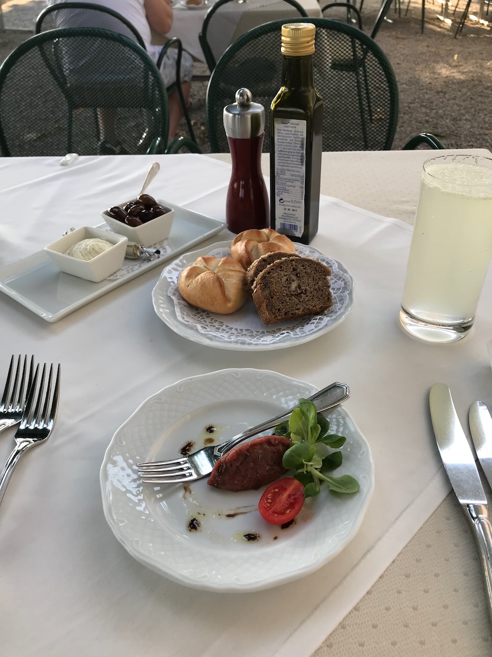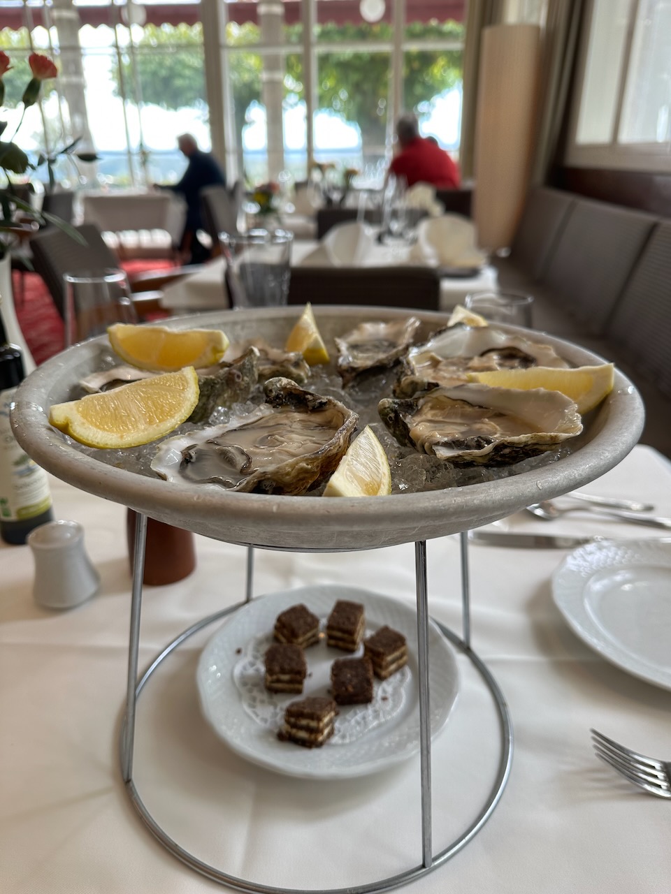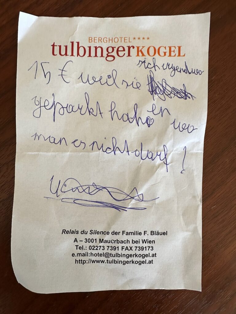 Als wir zurückgekommen sind, habe ich kurz direkt vor dem Haupteingang geparkt – und prompt ein „Strafmandat“ bekommen. Die Familie Bläuel feierte den Geburtstag eines ihrer Jüngsten und die Kindern haben sich den Spaß gemacht, mir einen handgeschriebenen Zettel an die Scheibe zu stecken: „15 Euro, weil sie geparkt haben, wo man es nicht darf.“ Die jungen Polizisten und ich haben uns dann auf fünf Euro geeinigt, weil ich zu meiner Verteidigung vorbringen konnte, dass ich nur den Koffer aufs Zimmer gebracht habe. Und selbst diese fünf Euro hat ihr Vater – der CHEF des Hauses – liebevoll „refundiert“ und uns statt 6 eben 7 seiner wunderbaren Austern servieren lassen.