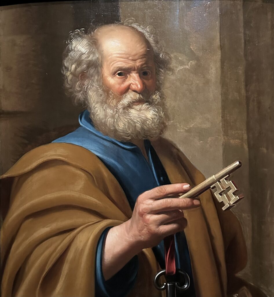 Petrus (leise, aber bestimmt): Ich trage den Schlüssel, Symbol der Macht, die mir anvertraut wurde. Christus sprach: „Dir will ich die Schlüssel des Himmelreichs geben.“ Mein Blick ist fest, mein Griff sicher. Ich bin Wächter des Glaubens, Hüter der Ordnung, Träger der Verantwortung.