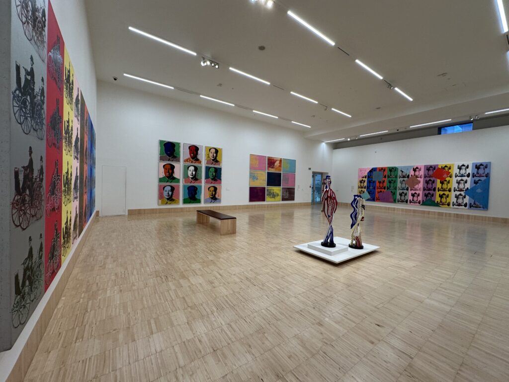 Wir gehen hinauf in den Ausstellungsbereich und betreten den ersten großen Saal. Es ist still, nur das gedämpfte Knirschen der Schritte auf dem Betonboden. Angenehm wenig Menschen sind heute hier. Zweitweise sind wir mit den Künstlern alleine. An der Wand hängen die glänzenden Karosserien von Andy Warhol – Rennwagen, abstrahiert zu Symbolen des Tempos, der Reproduktion, der Sehnsucht nach Geschwindigkeit. Ich bleibe davor stehen und denke: Das ist doch kein Bild eines Autos, sondern eines Zeitalters. Warhols „Mercedes-Benz Formel Rennwagen W125“ ist in Wahrheit ein Memento mori aus Chrom und Farbe. Geschwindigkeit vergeht, Ruhm vergeht, aber das Bild bleibt. Vielleicht ist das sein Trost: dass auch das Flüchtige einen Ort in der Ewigkeit finden kann.