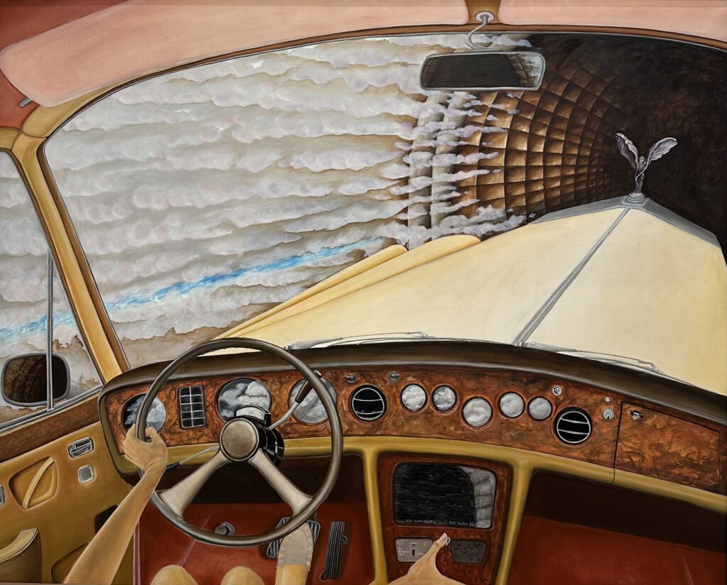 Ein paar Schritte weiter das Werk von Ida Szigethy. Ein Blick aus einem Rolls-Royce auf eine Wand, dahinter nichts als Dunkel. „Ohne Ausweg“, steht auf dem Schild. Ich spüre, wie sich der Raum verändert: Diese Malerei ist kein Luxusobjekt, sondern eine Beichte. Das glänzende Holzlenkrad wird zum Symbol jener Freiheit, die sich selbst überfordert. Was vor dem Autoradio auf den ersten Blick so aussieht wie ein Stöckel von Yuliya’s braunen Schuhen, ist bei näherer Betrachtung der Daumen der rechten Hand der Pilotin, die gerade einen neuen Sender eingestellt hat.