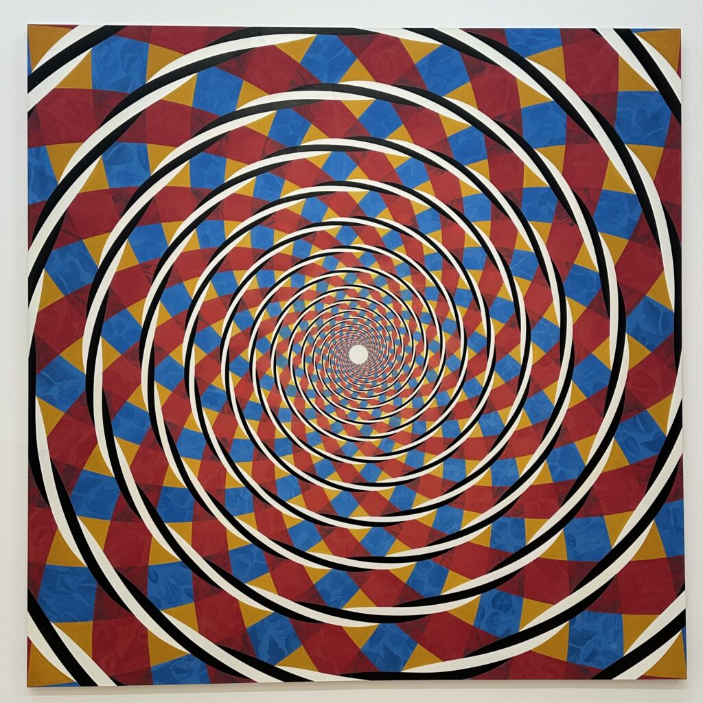 Vor einem der größten Werke des Raumes bleibe ich wie gebannt stehen: ein farbig pulsierender Strudel, eine Spirale, die mich förmlich in sich hineinzieht. Es könnte auch der Blick in den Lauf eines teuren Luftdruckgewehres mit einem gezogenen Lauf sein. Philip TaaffesUnit of Direction aus dem Jahr 2003. Rot, Blau, Gelb – Primärfarben wie Signale – kreisen in präziser Geometrie um ein winziges Zentrum, das zugleich wie ein Auge und wie ein Versprechen wirkt.