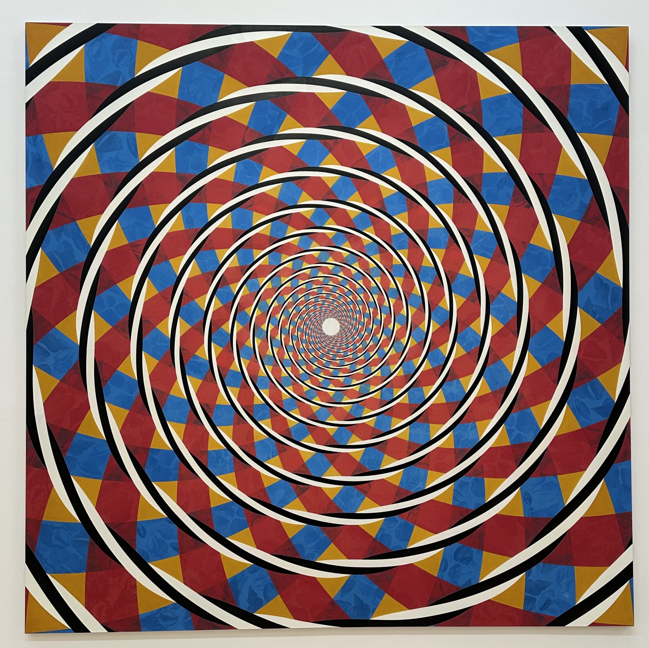 Ich lese die Tafel daneben. Taaffe, so erfahre ich, hat sich jahrelang mit Ornamentformen aus verschiedenen Kulturen beschäftigt – von römischen Mosaiken über islamische Arabesken bis zu fernöstlichen Mandalas. Je länger ich schaue, desto mehr erkenne ich: Diese Spirale ist kein Ornament, sondern eine Bewegung des Geistes. Sie zieht mich hinein in etwas, das weder rational noch dekorativ ist – ein Sog, der mich an das Denken selbst erinnert: immer kreisend, suchend, niemals still.