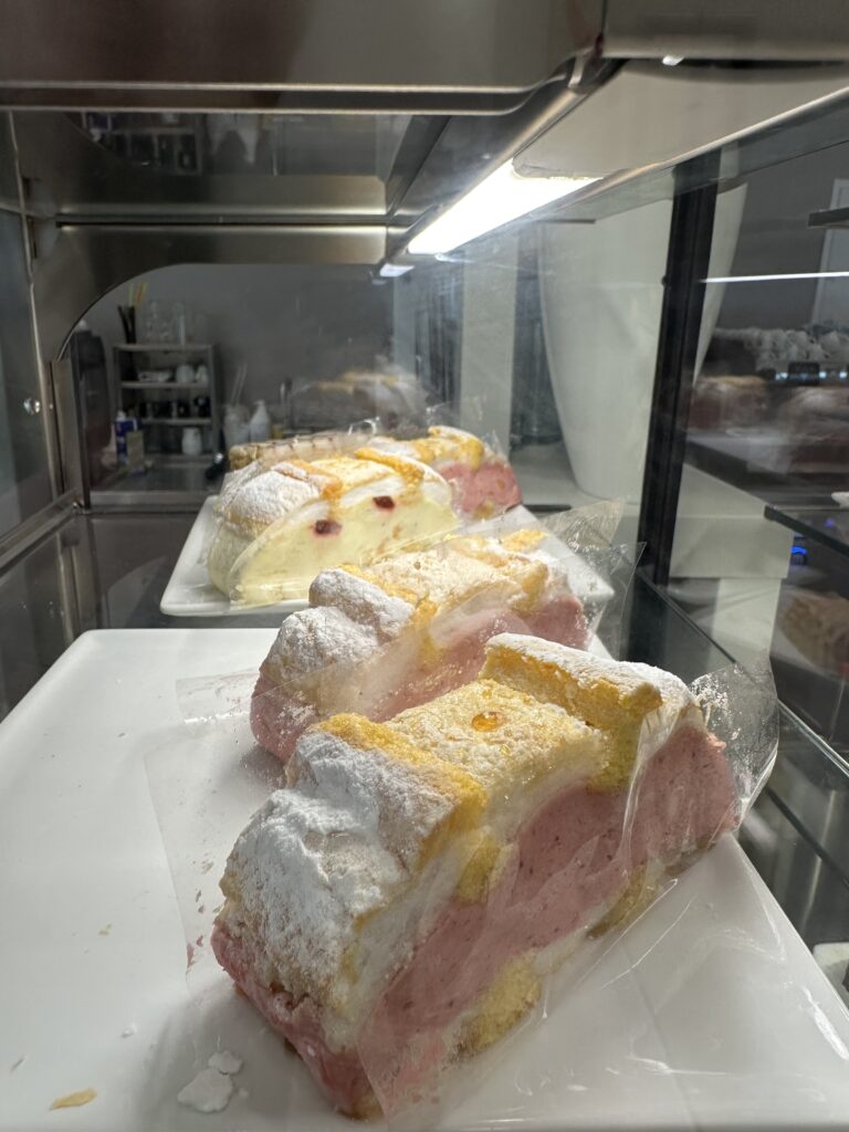 Danach folgen wir dem Duft von Kaffee. Oben, beim Café neben den Ausstellungsräumen, stehen sie in der Vitrine: rosa und gelbe Cremeschnitten, so weich und leicht wie ein ironischer Nachsatz der Kunst. Wir teilen keine, weil ich Yuliya noch ein spätes gutes Mittagessen zaubern werde. Aber wir lachen fröhlich, weil auch diese süsse Kreation für uns im Moment Kunst ist. Alles, was eben noch schwer war – Gewalt, Schmerz, Verwandlung – löst sich auf in Süße und Staubzucker.