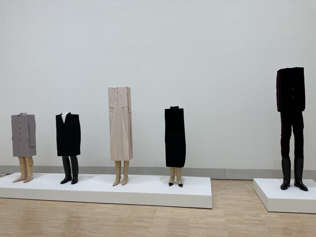Ein paar Räume weiter: Erwin Wurm. Fünf Figuren stehen da, elegant und grotesk zugleich. Köpfe gibt es keine, die Körper enden abrupt in eckigen Blöcken. Anzüge, Stiefel, Kleider – makellos. Ich muss lächeln. Wurm nimmt die modische Oberfläche ernst genug, um sie zu sprengen. Seine Box People sind Karikaturen unserer Gesellschaft: zu perfekt, zu eckig, zu sehr auf Form und Status fixiert.