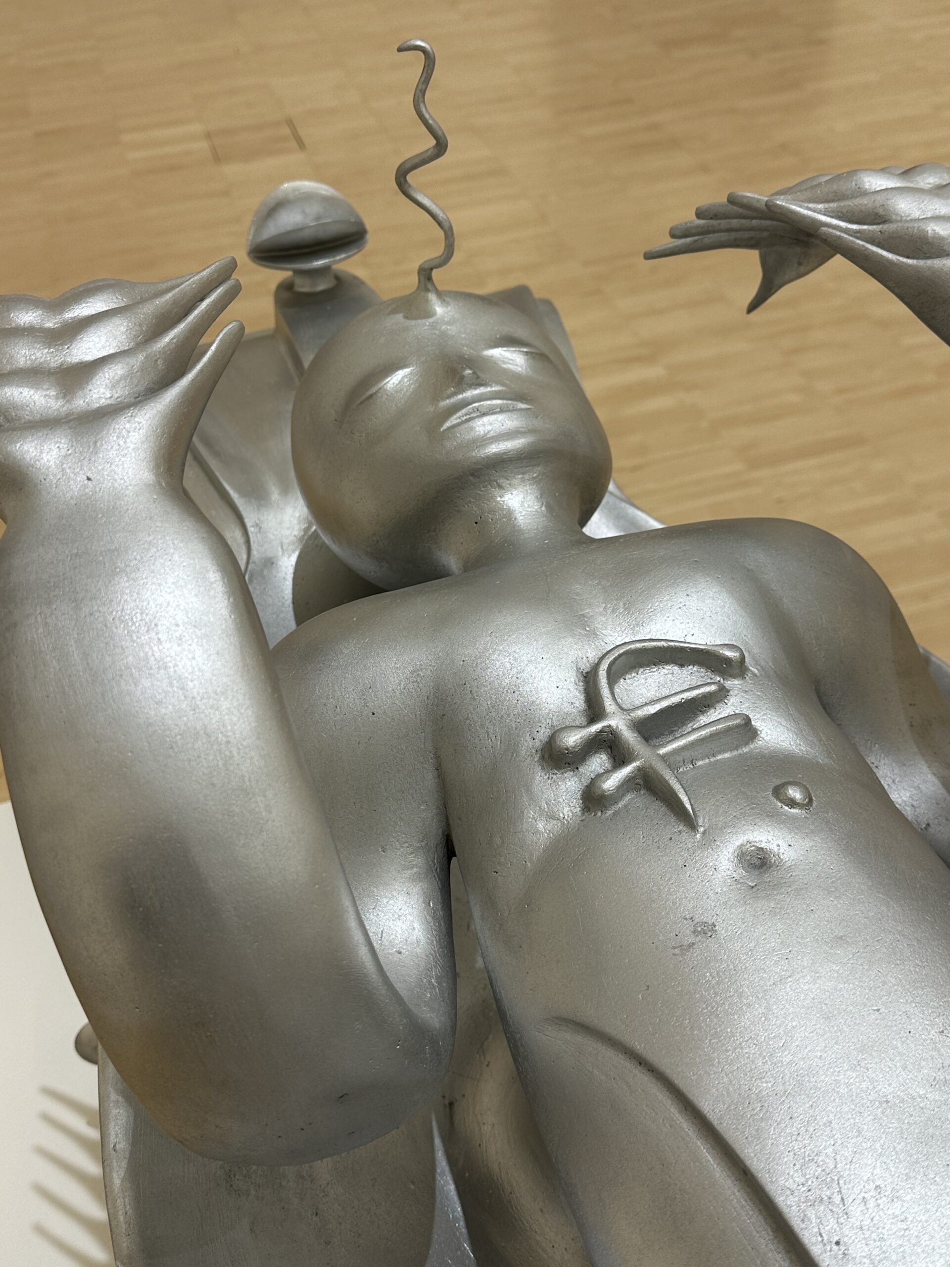 Nach Wurm wird es stiller. Kälter. Ich trete in den Raum von Bruno Gironcoli – und plötzlich scheint die Luft aus Metall zu bestehen. Vor mir liegt eine Figur, silbern, glatt, monumental: Daphne, 2002. Kein klassischer Akt, keine anmutige Verwandlung, sondern ein hybrides Wesen zwischen Mensch und Maschine, Opfer und Schöpfer.