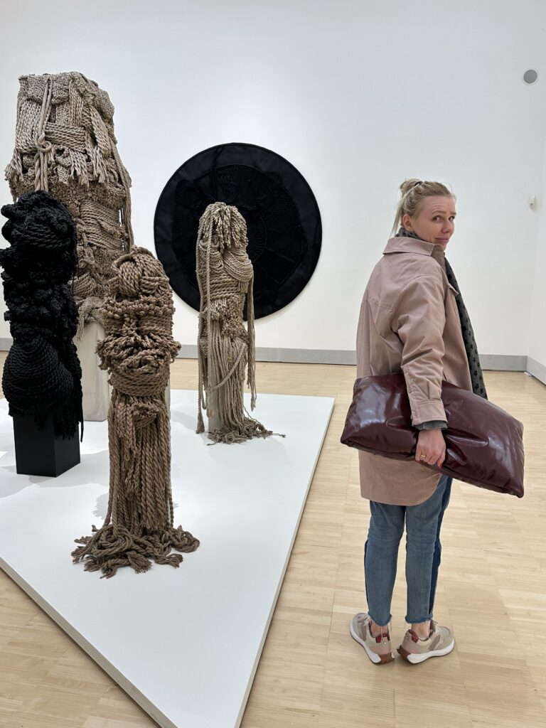 In den Seilen, die sie zu Skulpturen knüpft, scheint sich die Spannung des Lebens selbst zu verdichten. Jeder Knoten ist zugleich Fessel und Verbindung. Und als ich mich umdrehe, sehe ich Yuliya vor diesen Figuren stehen – in sanftem Rosa, die Hand auf der Tasche, still, aufmerksam. Ein schöner Moment: zwei Frauen, die sich nicht kennen, und doch etwas Gemeinsames teilen – das stille Wissen, dass Freiheit immer eine innere Bewegung bleibt.