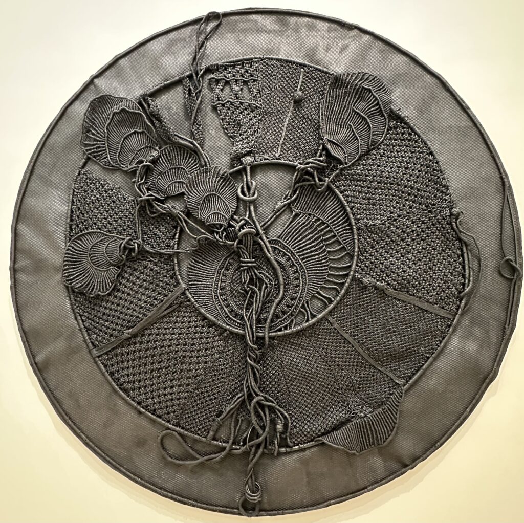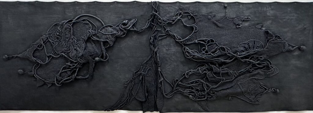 Hinter den Seilfiguren von Soli Kiani erkenne ich an der Wand noch einmal ein rundes, fast mandalaartiges Werk von Elena Koneff – ein schwarzes Relief aus Kordeln und Gummi, das wie ein stiller Planet im Hintergrund ruht. Dieses Werk scheint die Szene zu umarmen: Die Bewegung der Stricke bei Kiani antwortet auf die geordnete Ruhe Koneffs. Das Schwarz beider Arbeiten ist kein Nichts, sondern ein Speicher von Bedeutung – ein Stoff, der Licht verschluckt, um Tiefe zu erzeugen.