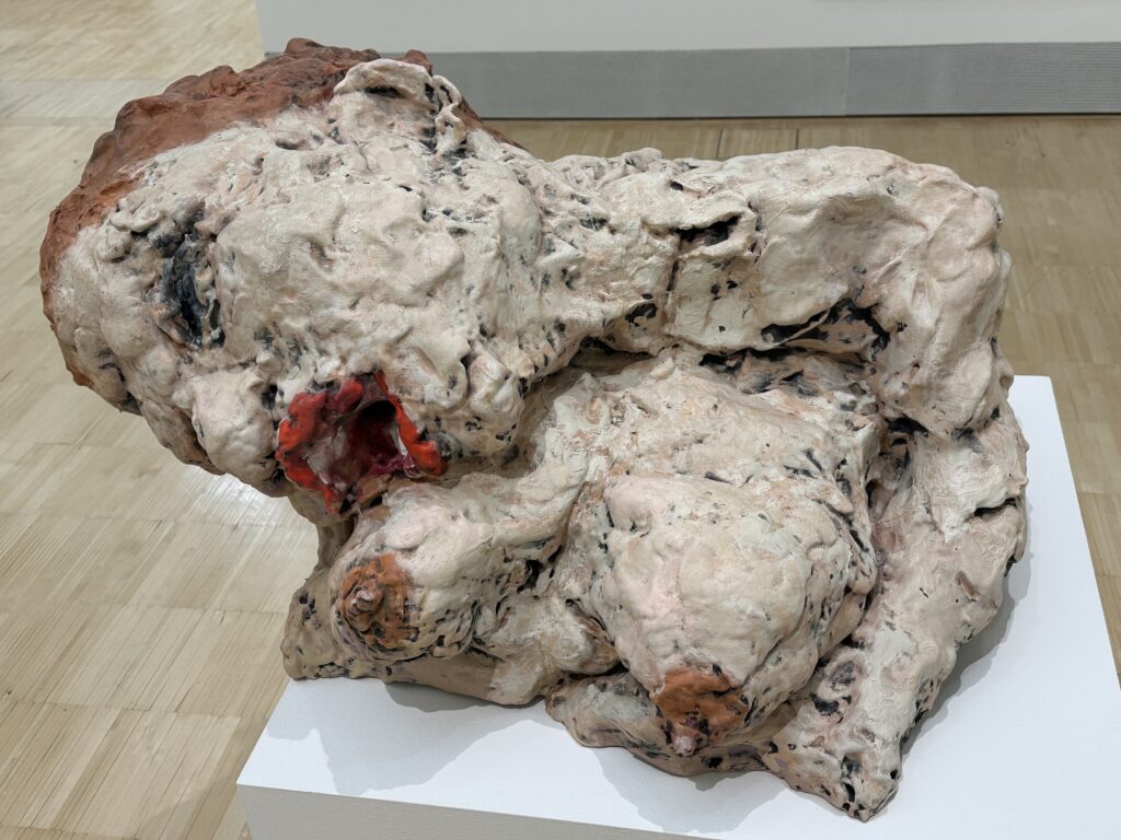 Dann ein unförmiger, fleischfarbener Körper, irgendwo zwischen Figur und Masse. Die Oberfläche scheint lebendig und zugleich wie verbrannt, durchzogen von schwarzen Adern, an manchen Stellen mit leuchtend rotem Acryl aufgerissen. Der Titel: Eva Beresin, In Ekstase verweilen (2023).