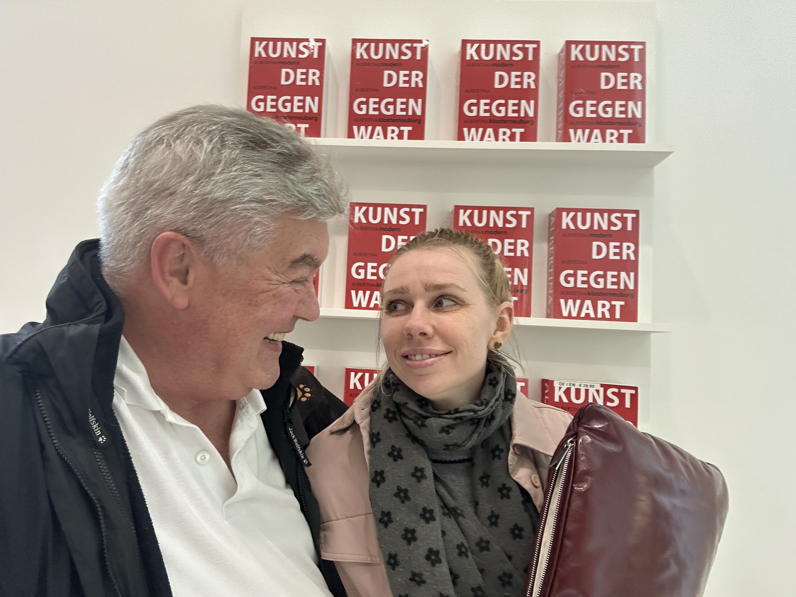 Bevor wir gehen, halten wir noch kurz inne. Eine Wand voller Bücher mit der Aufschrift Kunst der Gegenwart – in kräftigem Rot, als wollte sie sagen: Das Heute zählt. Wir sehen uns an, lächeln. Ja – das tut es.