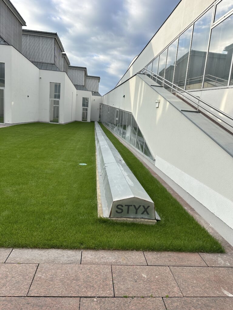 Draußen, gleich zwischen den Ausstellungsräumen, stehen wir vor einer silbernen Abdeckung aus Metall. Darauf in schwarzen Lettern: STYX. Zuerst halte ich es für eine Wasserleitung, doch ein Mitarbeiter erklärt uns: „Das ist die Abdeckung eines Kunstwerks – ‚Welle‘. Die Firma, die sie gefertigt hat, heißt Styx.“ Ein schöner Zufall: Der Name erinnert an den Fluss, der Leben und Tod trennt – und verbindet. Hier oben, zwischen Glas, Beton und Rasen, fließt er nun als Kunstwerk weiter – still, metallisch, aber voller Bedeutung. Oder vielleicht ist die Welle einfach eine zärtliche Geste an eine Frau, die sich hier Blumen wünschte.