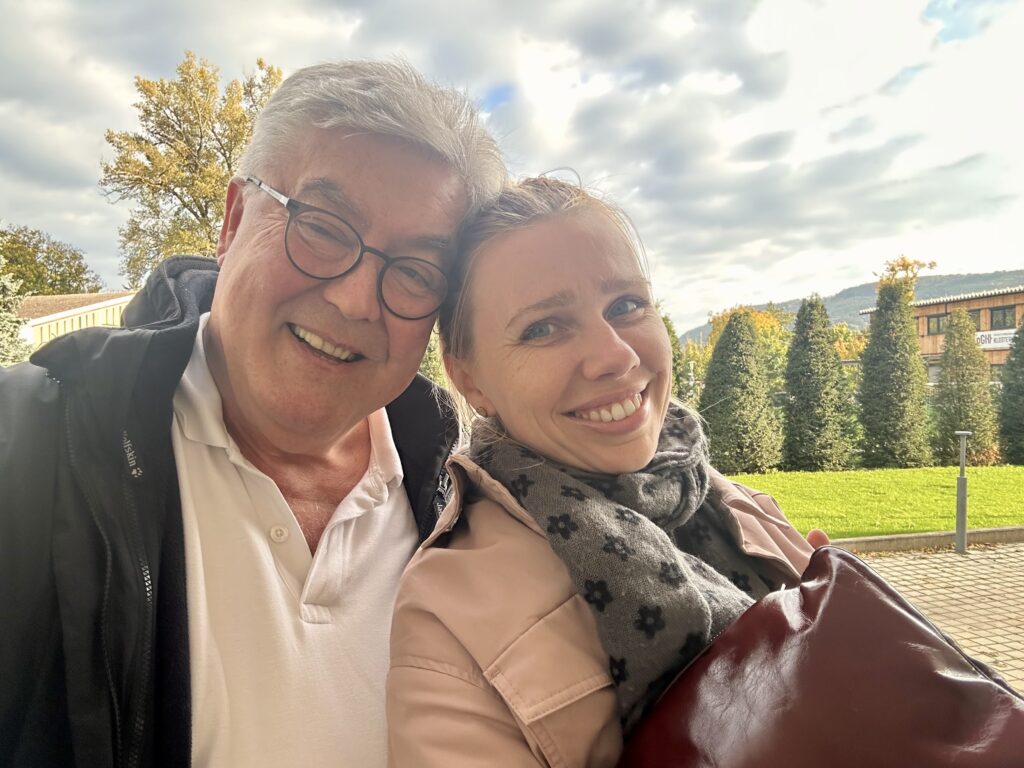 Und dann, unten nach dem Ausgang, das letzte Foto. Das Licht ist weicher geworden, die Luft still. Yuliya lehnt sich an mich, die Wiesen leuchten hinter uns, als hätten sie alles gehört. Wir denken an Michaelina Wautier gestern im KHM, an Wurm, Diop, Gironcoli, Beresin, Koneff, Kiani heute hier – und an all das, was sie gemeinsam verbindet: Mut, Genialität und Menschlichkeit.