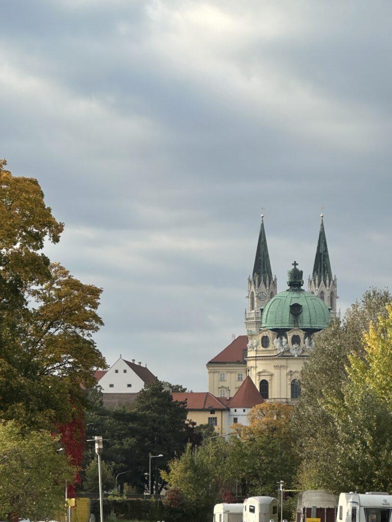 Ich stehe am Eingang der Albertina Klosterneuburg, einem dieser Orte, an denen die Gegenwart so still und selbstverständlich in Erscheinung tritt, dass man fast vergisst, wie jung sie eigentlich ist. Der Raum – großzügig, kühl, klar – empfängt uns mit einer Offenheit, die keine Schwellenangst kennt. Julia geht ein paar Schritte voraus, bleibt dann stehen und lächelt. Draußen stehen Pferde in ihren Koppeln und scheinen amüsiert und zufrieden zu, warten – worauf?. Dahinter gibt der wolkenverhangene Himmel für wenige Minuten den Blick auf die Kuppel von Stift Klosterneuburg frei. Das Licht ist diffus – ideal für Portraits.