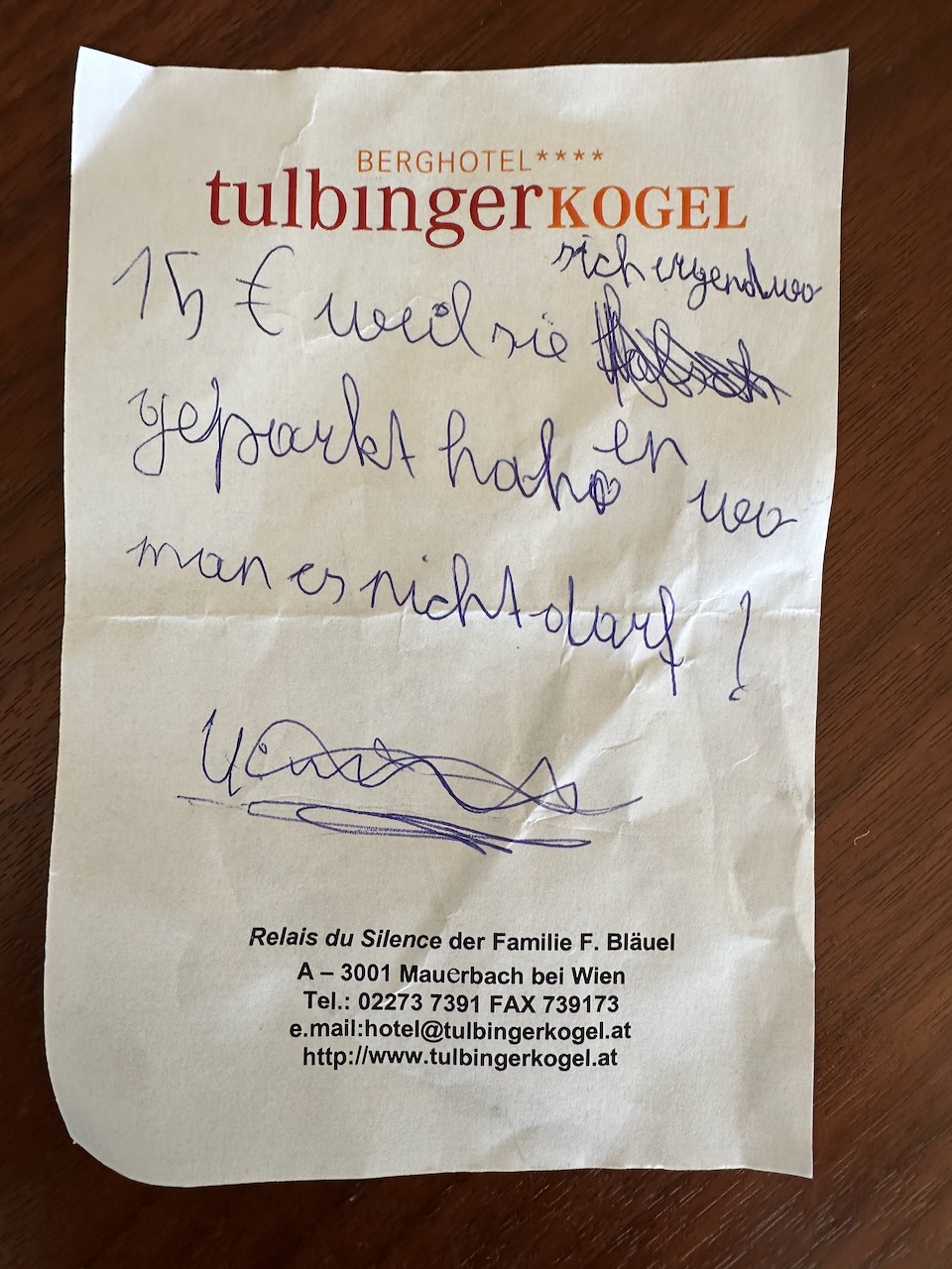 Ich dachte mir: Es wird ja wohl im Umkreis von Wien ein Hotel mit Schwimmbad geben und wenn ich höflich frage und dort esse, kann ich vielleicht auch Baden gehen. Google Maps führte mich bald in die Gegend von Mauerbach und ich erinnerte mich an ein modernes Hotel mit schönem SPA, das ich von mehreren Seminaren kannte. Fehlanzeige: nur für Hotelgäste und außerdem voll.