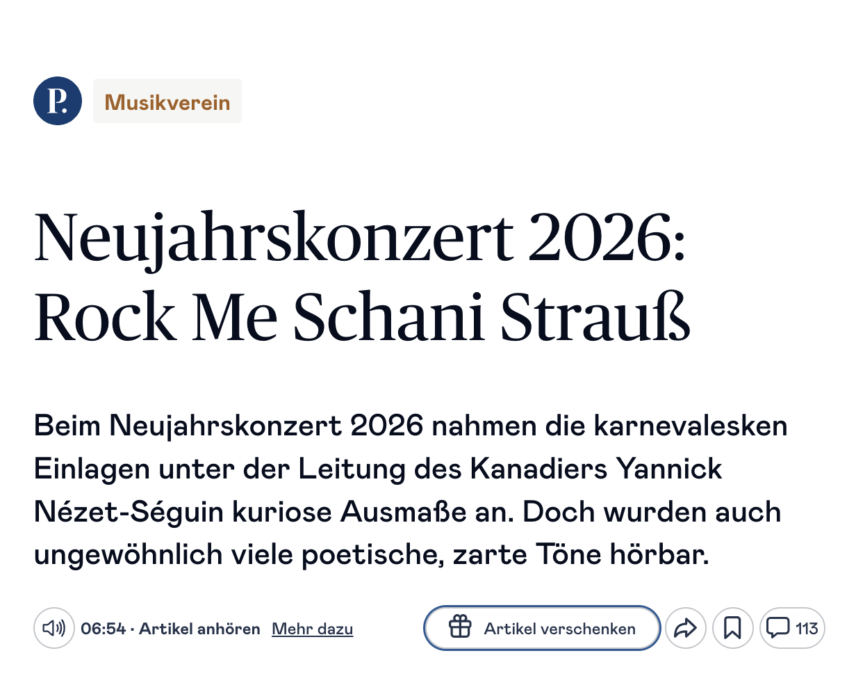 Das Neujahrskonzert 2026 unter Yannick Nézet-Séguin war ein bewusster Balanceakt: äußerlich verspielt, ja karnevalesk, musikalisch jedoch überraschend poetisch, leise und differenziert. Trotz Showmomenten – bis hin zum Gang des Dirigenten ins Publikum beim Radetzkymarsch – blieb der Klang der Wiener Philharmoniker weitgehend frei von Effekthascherei.