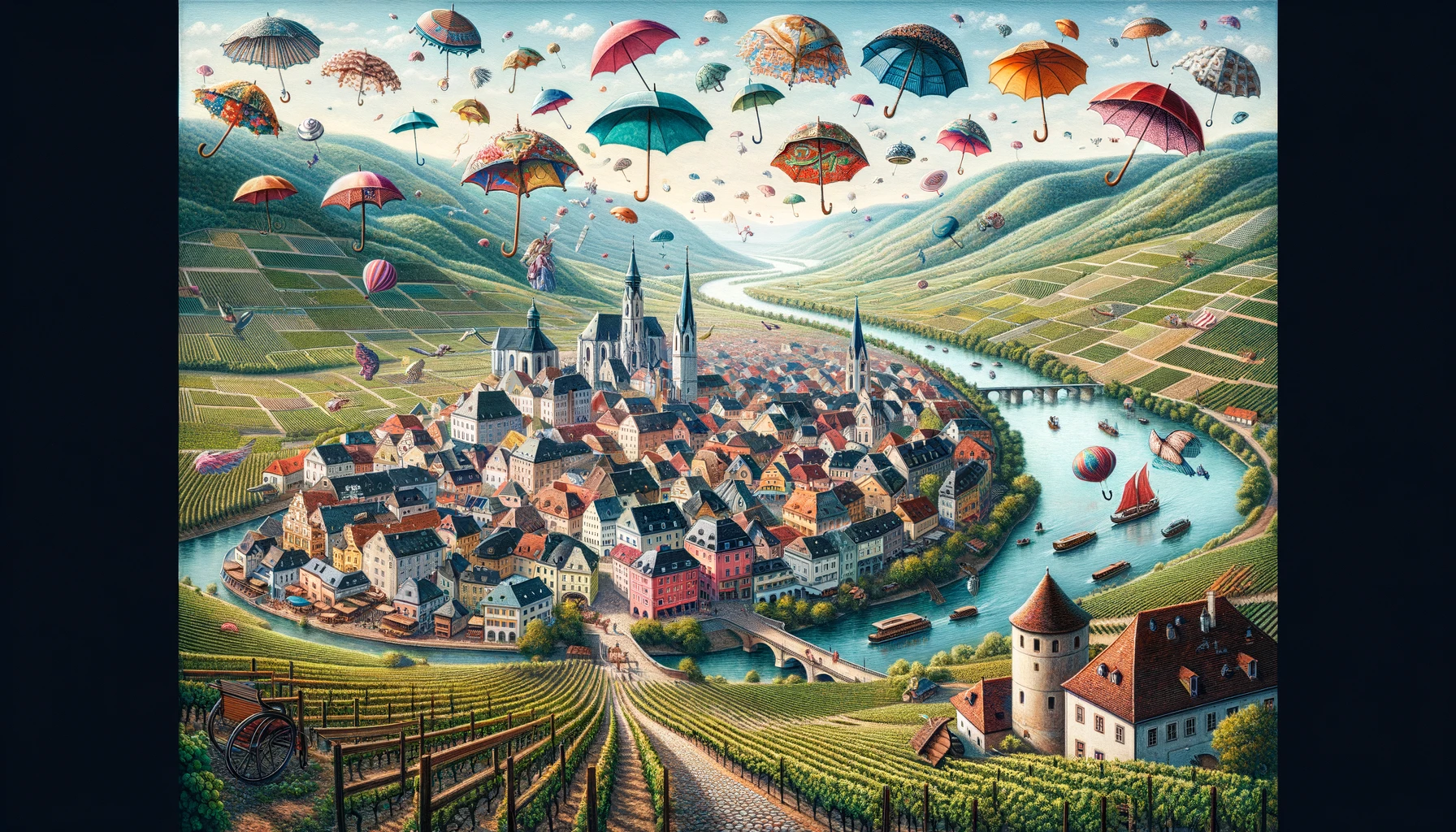 Vorheriges BildNächstes Bild DALL·E 2023-11-12 05.52.13 – An imaginative and detailed depiction of the Wachau Valley, Austria, with a focus on its character. Stift Göttweig and Dürnstein are subtly included i