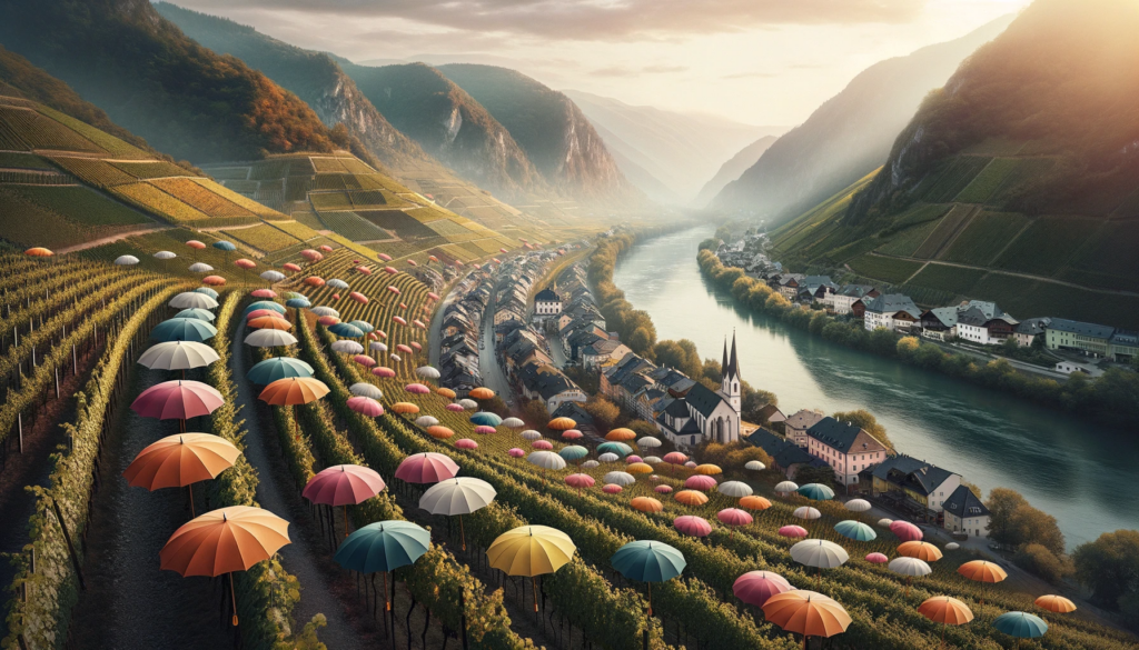 Vorheriges BildNächstes Bild DALL·E 2023-11-12 05.52.28 – A realistic art print photo of the Wachau Valley between Stift Göttweig and Krems, Austria, filled with Sapor umbrellas in their current colors. The u